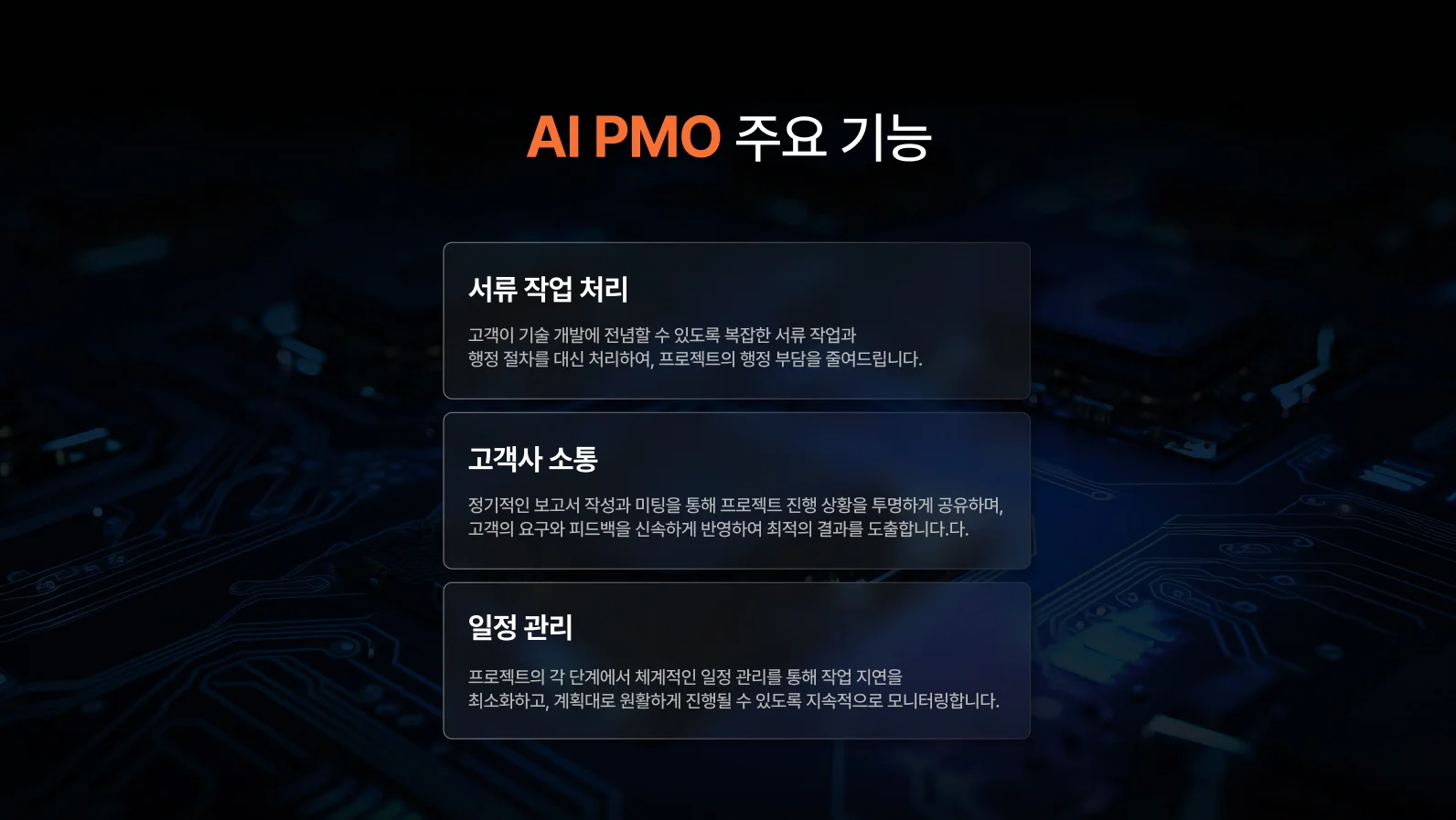오늘은 저희가 새롭게 선보이는 AI 프로젝트 관리(PMO) 서비스를 소개해드리려 합니다. 이 서비스는 기업들이 AI 프로젝트를 추진하면서 겪는 다양한 문제들을 해결하도록 설계되었으며, AI 도입을 고민하는 기업들에게 실질적인 도움을 제공할 수 있습니다.