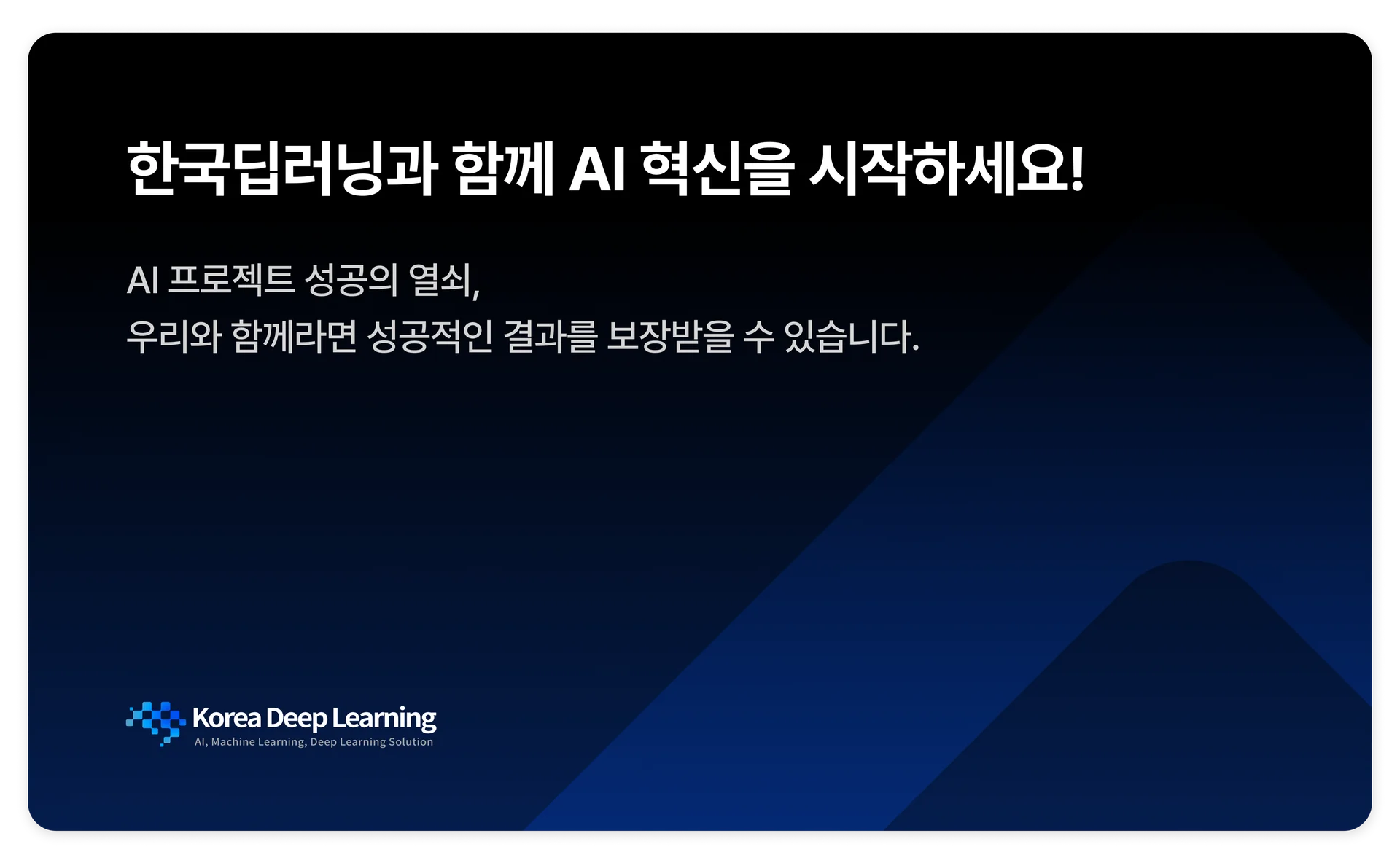 한국딥러닝은 AI 전문 기업으로서, AI 프로젝트에 대한 깊은 이해와 경험을 바탕으로 고객이 기술을 도입하는 과정에서 발생할 수 있는 문제들을 선제적으로 해결합니다. 저희는 단순한 관리 서비스를 넘어, 고객사의 특성에 맞춘 맞춤형 관리를 제공합니다. 프로젝트 진행 중 발생할 수 있는 기술적 문제나 행정적 어려움에 대해 미리 파악하고 해결책을 제시함으로써 프로젝트가 원활하게 진행될 수 있도록 지원합니다. 이러한 차별화된 접근은 고객과의 신뢰를 바탕으로 한 협력관계를 강화하고, 성공적인 프로젝트 결과를 이끌어내는 데 중요한 역할을 합니다.