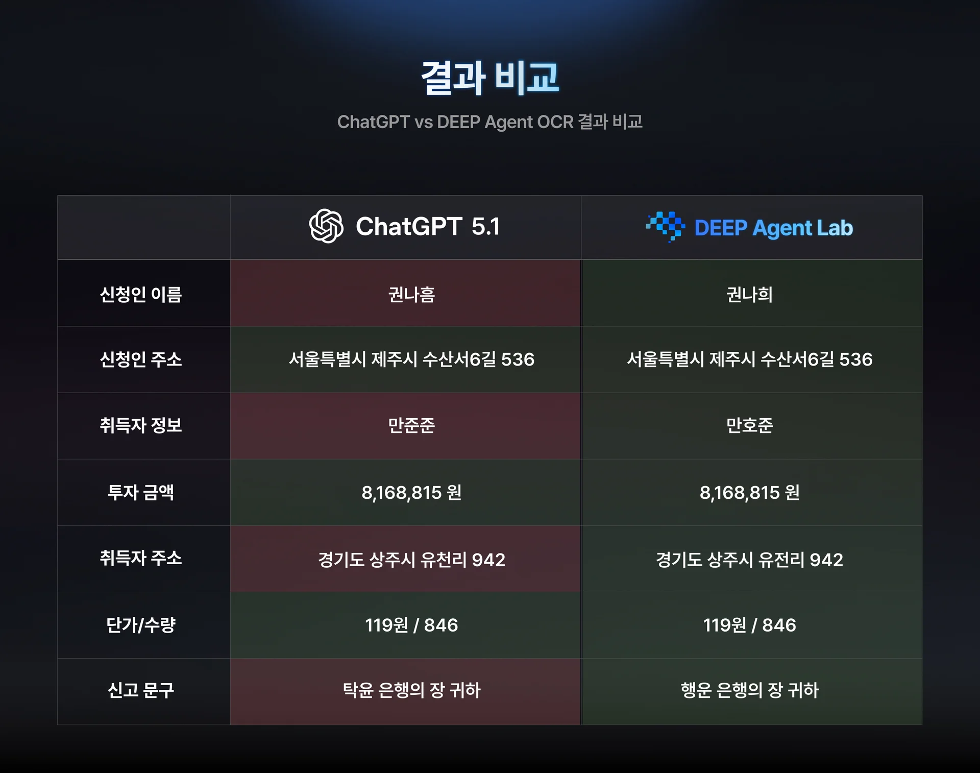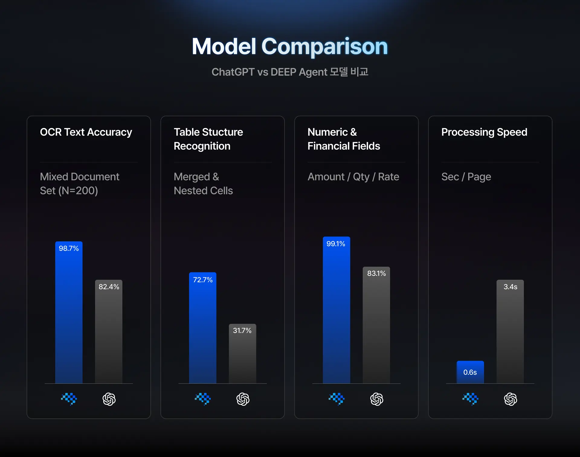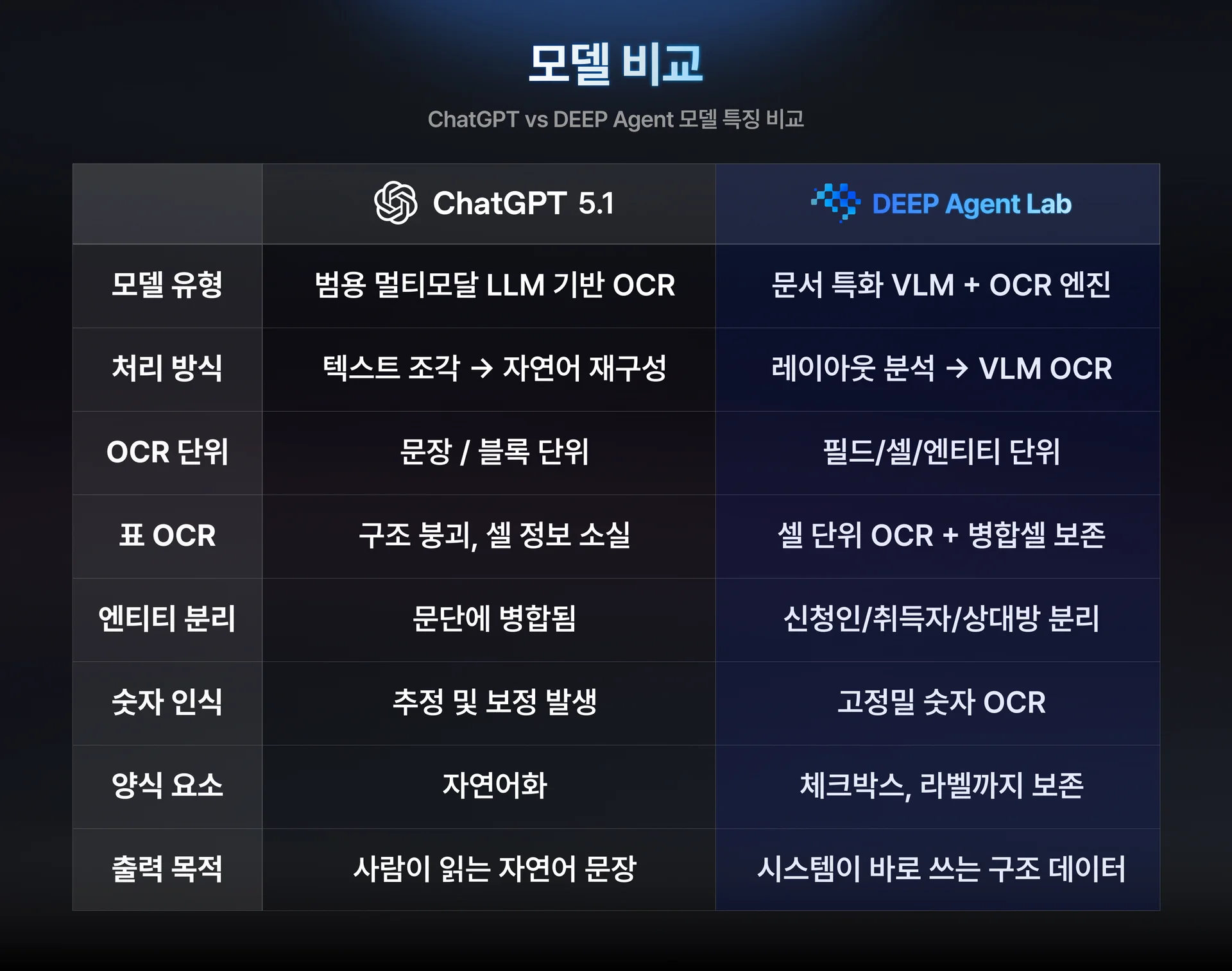 아래는 ChatGPT와 DEEP Agent Lab이 OCR을 처리하는 방식이 근본적으로 다름을 보여주는 모델 비교다.