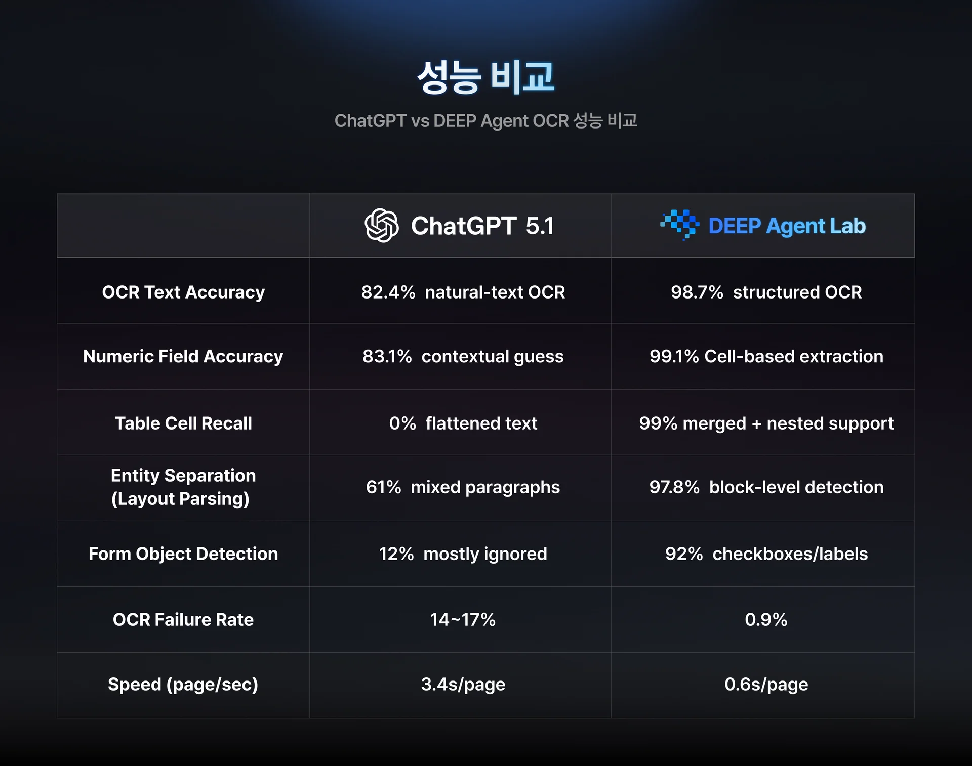 OCR Text Accuracy부터 속도까지, DEEP Agent Lab이 모든 지표에서 안정적 우위를 보인다. 직관적으로 이해하기 쉬운 그래프이기 때문에 가장 많이 공유된 섹션이기도 하다.