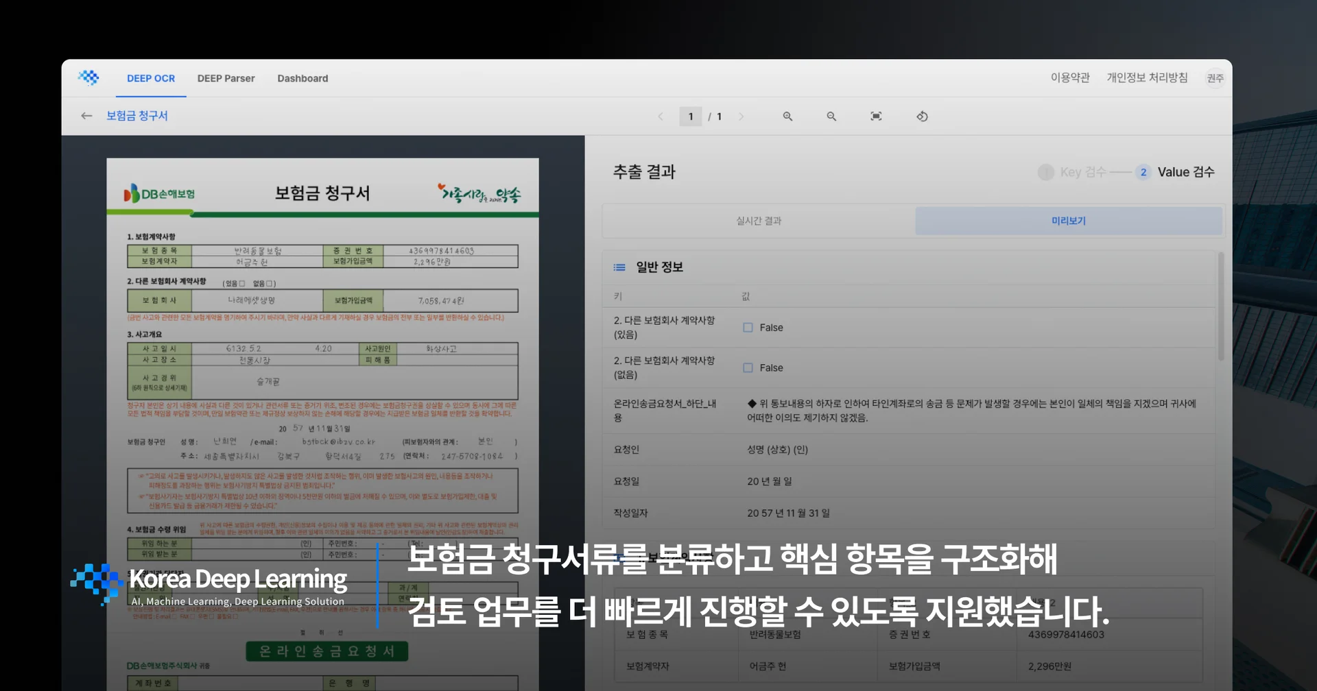 이를 개선하기 위해 B보험사는 단순 OCR 추가가 아니라, DEEP Agent를 통해 문서를 먼저 분류하고 핵심 항목을 구조화한 뒤, 문서 간 비교가 필요한 값을 한 화면에서 검토할 수 있게 하는 방식으로 접근했습니다. 또한 불일치 항목이나 신뢰도가 낮은 항목만 사람이 우선 확인하도록 검토 흐름을 바꿨습니다.