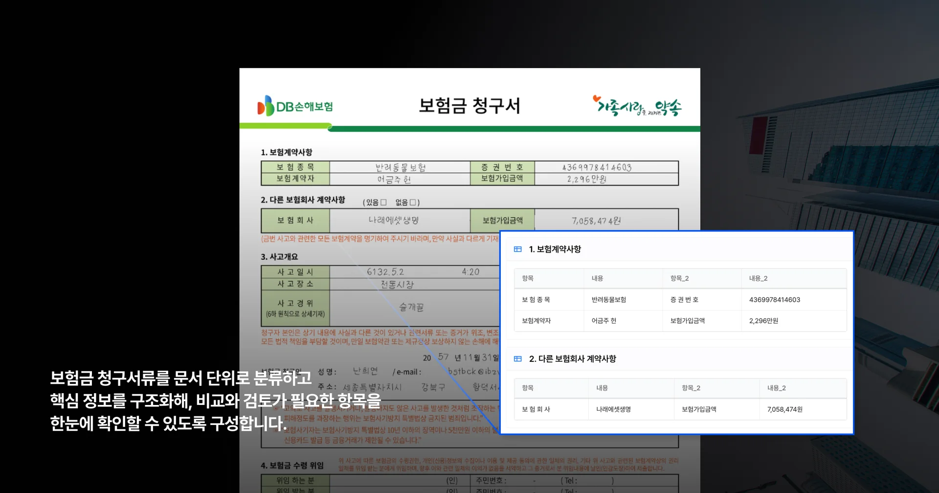 하지만 보험사 내부에서는 이야기가 다릅니다. 고객이 제출한 보험금 청구서류는 바로 처리되는 데이터가 아니라, 담당자가 다시 읽고 비교하고 확인해야 하는 검토 대상이 되기 때문입니다.