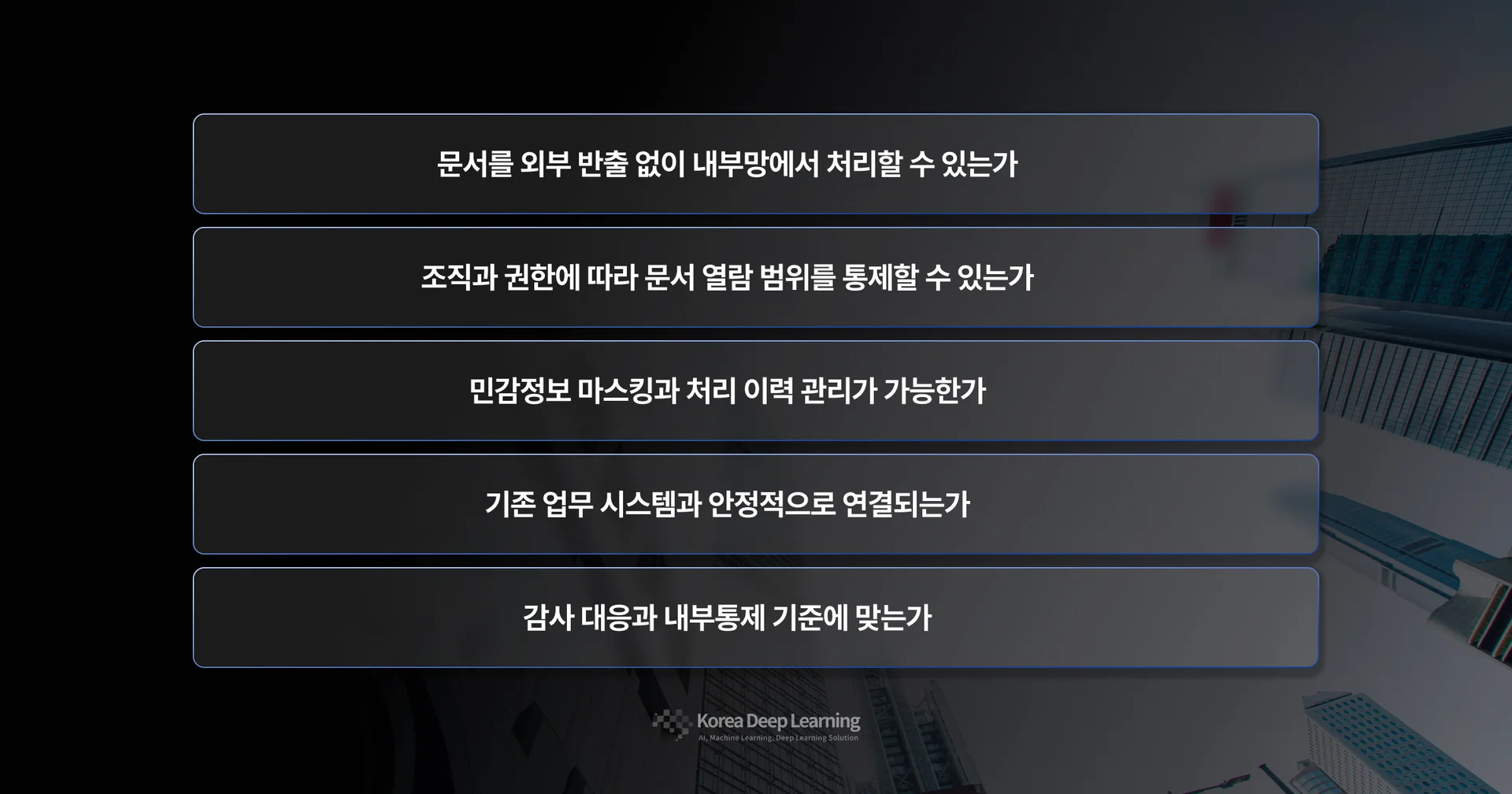 문서 분류·정보 추출·검수·권한통제·감사추적·시스템 연계를 하나의 운영 구조로 묶는 데 있습니다.