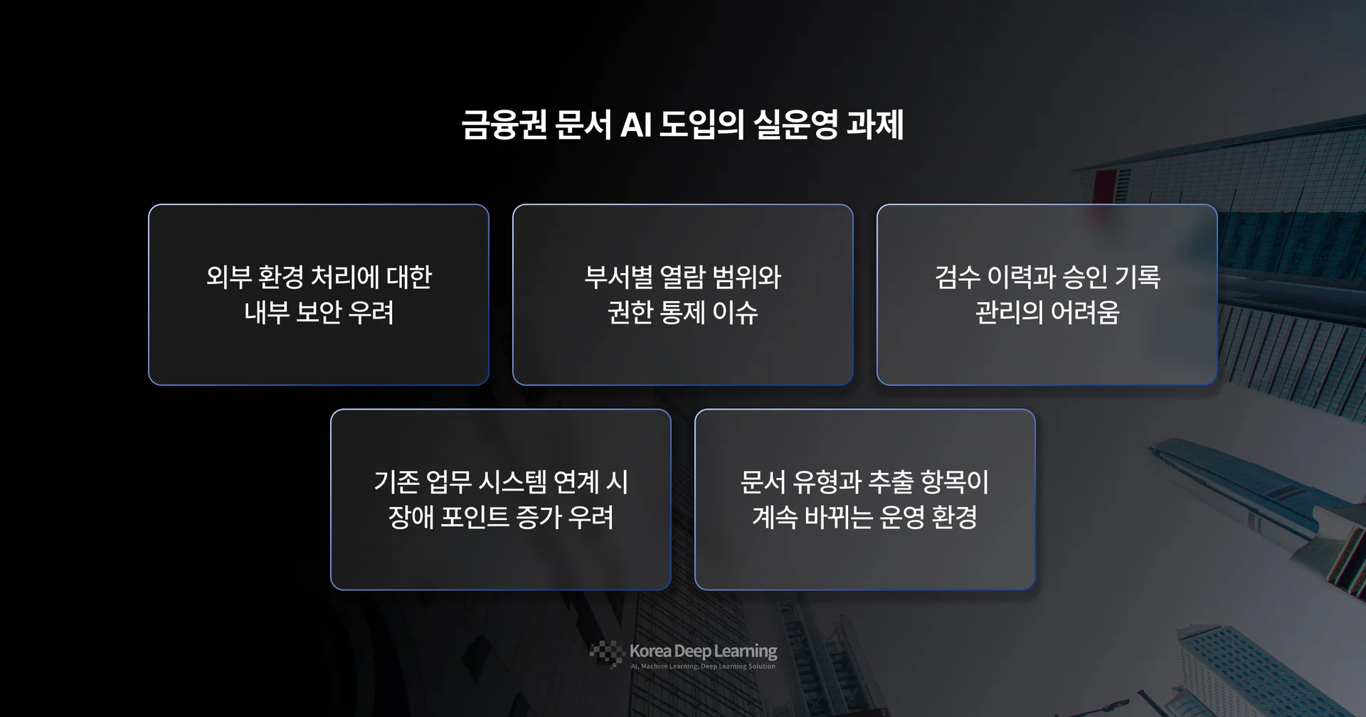 외부 클라우드로 민감한 문서를 보내지 않고, 내부 시스템과 연결된 상태에서 문서 자동화를 운영할 수 있다는 점 때문에 금융권의 관심이 커지고 있습니다.