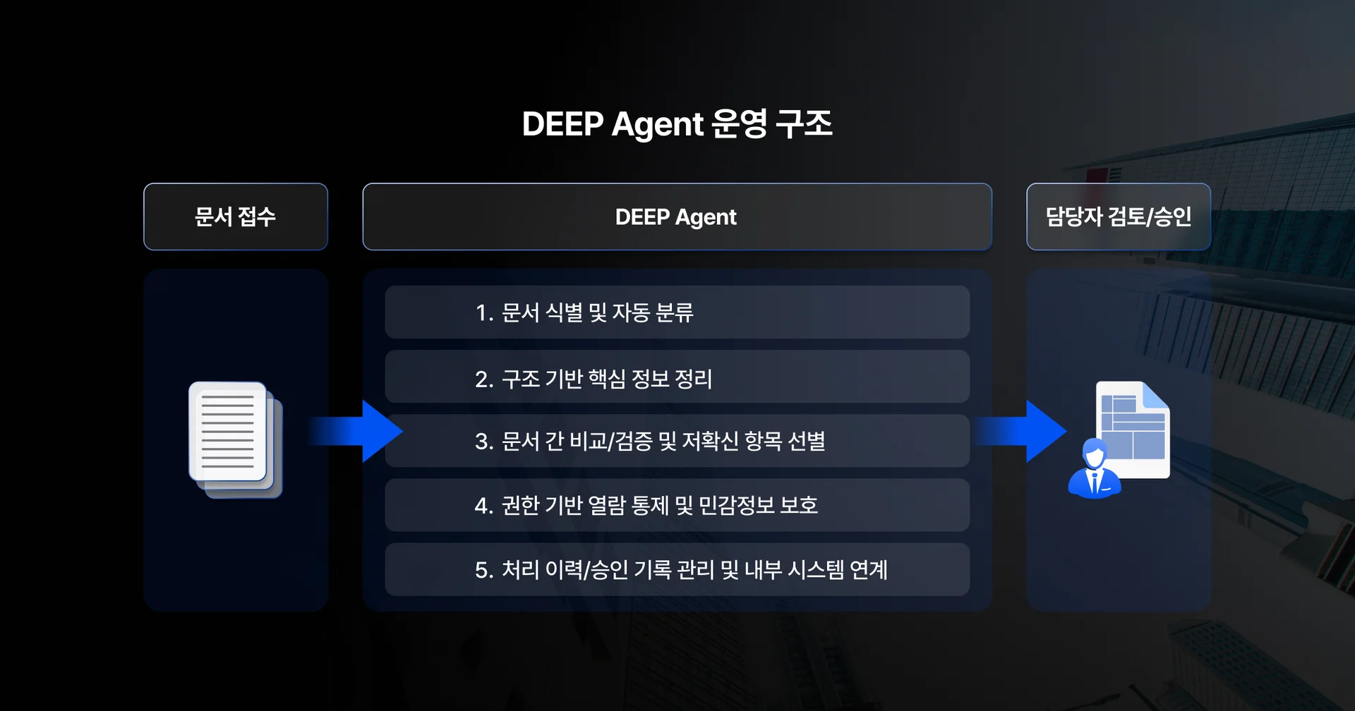 문서 접수 → 내부망 내 문서 분류 → 핵심 정보 구조화 → 문서 간 비교·검증 → 검수 대상 선별 → 담당자 검토 및 승인 → 내부 시스템 반영