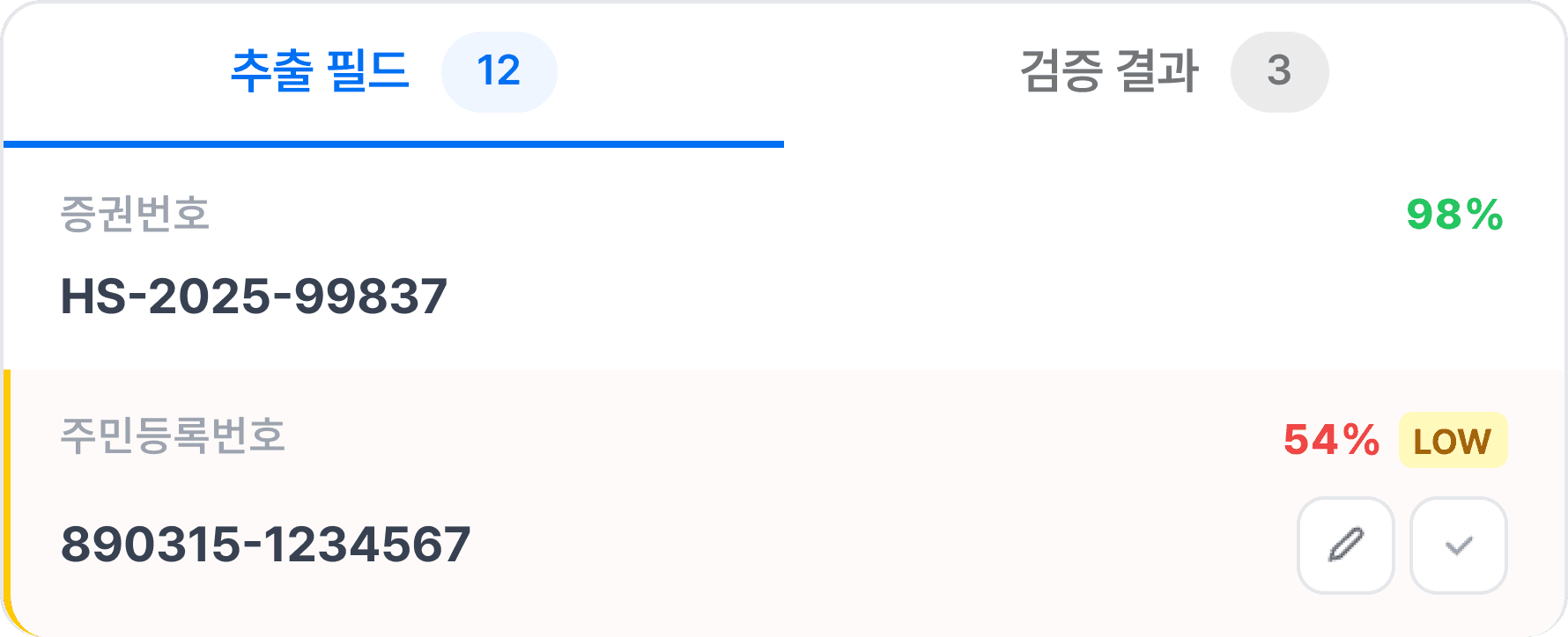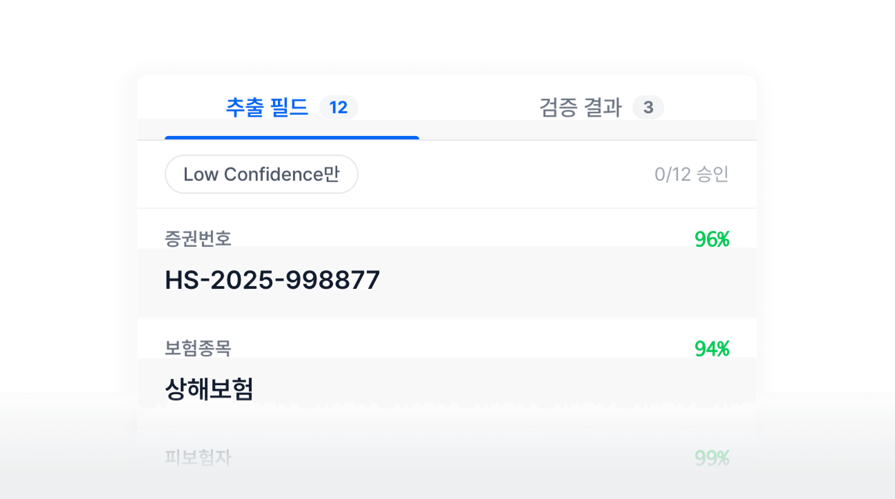사람의 피로도를 낮추는 One-Screen UI를 제공합니다. 원문과 추출 결과를 나란히 띄우고, AI가 확신하지 못하는 값만 하이라이트하여 검수를 돕습니다.