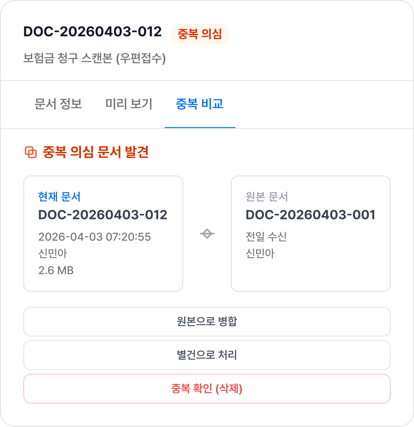 문서를 분류하고 데이터를 추출한 뒤, 금액 계산 및 기존 고객 정보와의 정합성을 검증합니다.